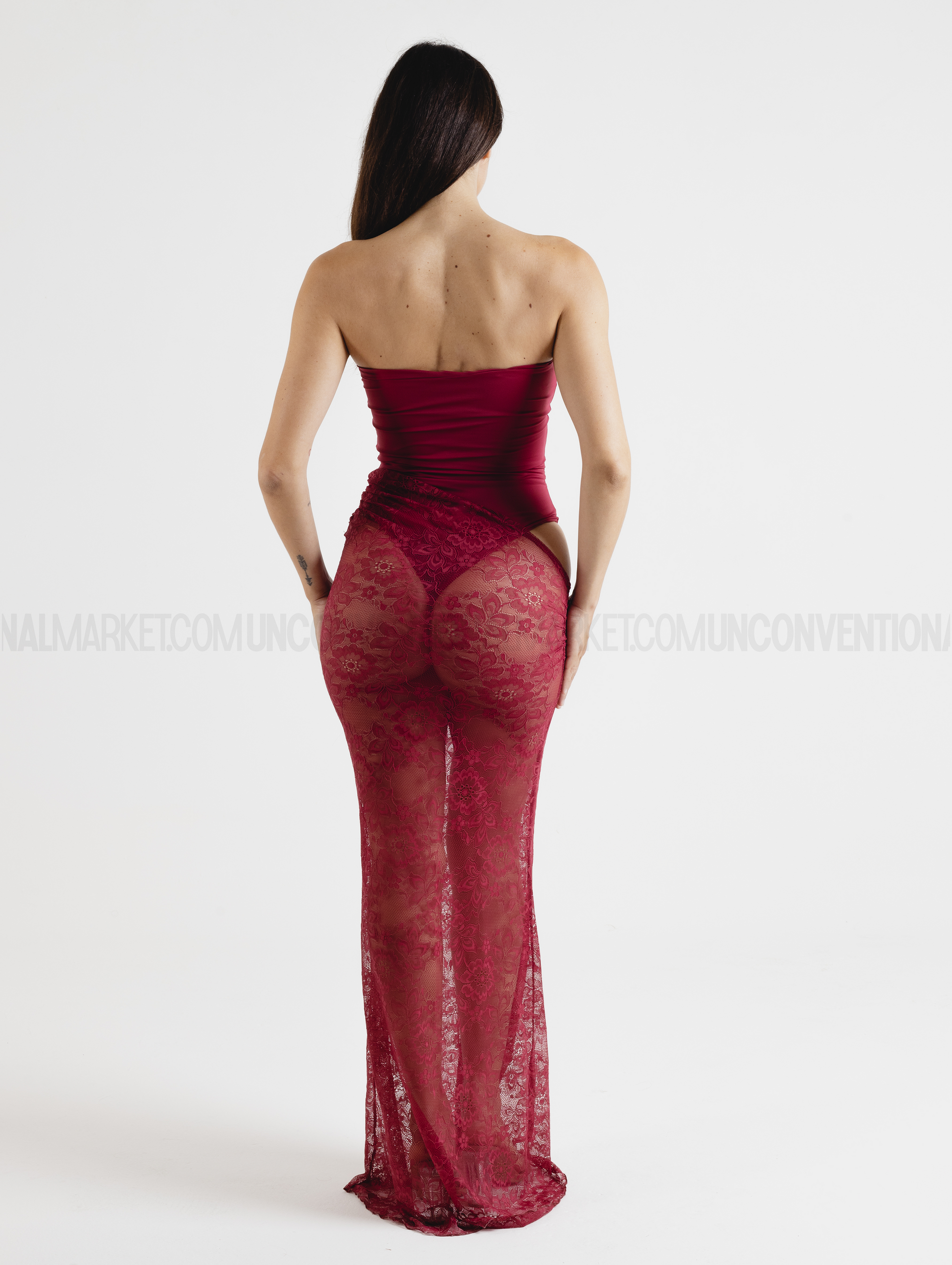 Set composto da body a fascia in microfibra morbida e avvolgente, gonna lunga in pizzo elasticizzato