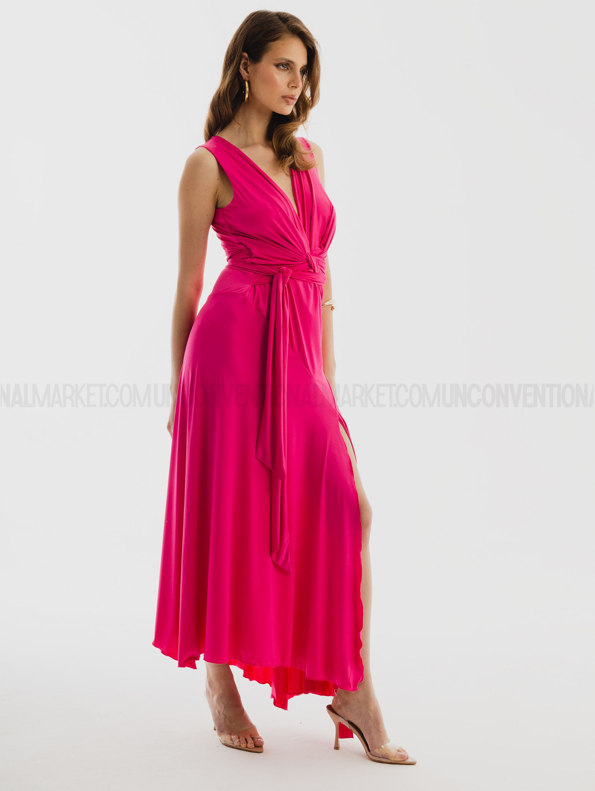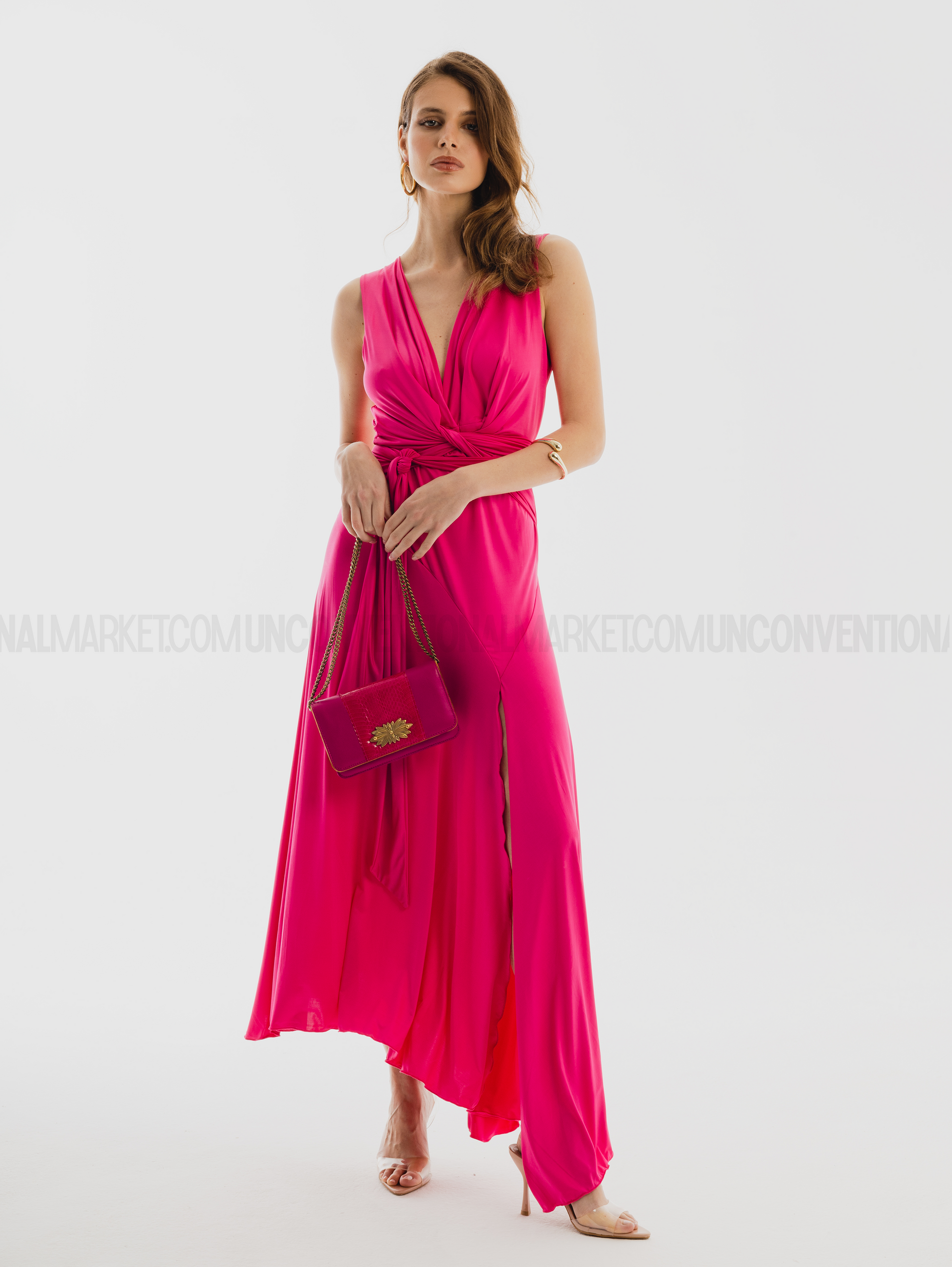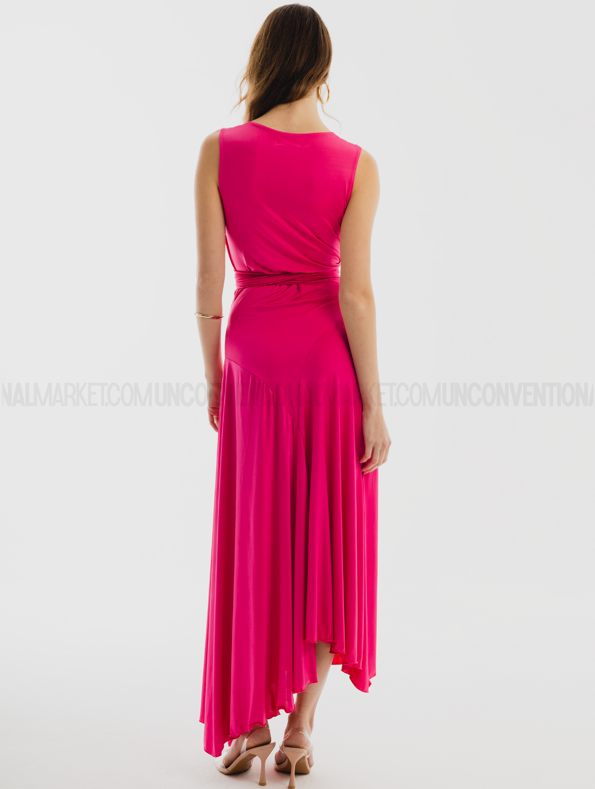Abito lungo senza maniche con scollo a V incrociato, annodatura con morbide fasce da incrociare sul punto vita , gonna ampia svasata ed asimmetrica con spacco laterale, avvolgente sul busto e dalla linea morbida e cadente.