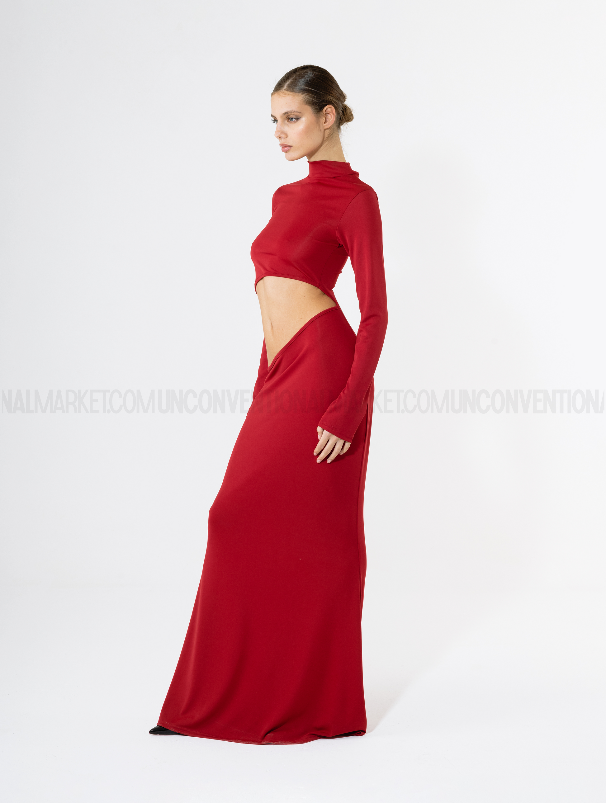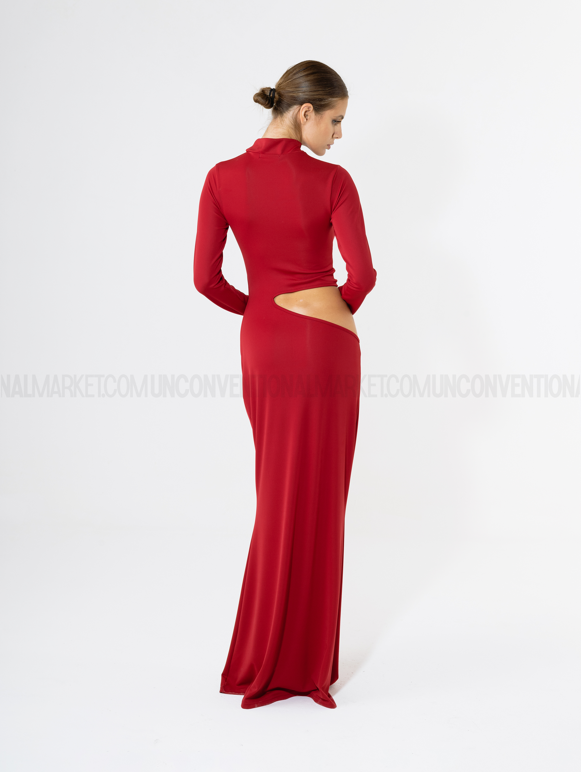 Abito lungo reversibile, collo alto, asole per i pollici, apertura obliqua.