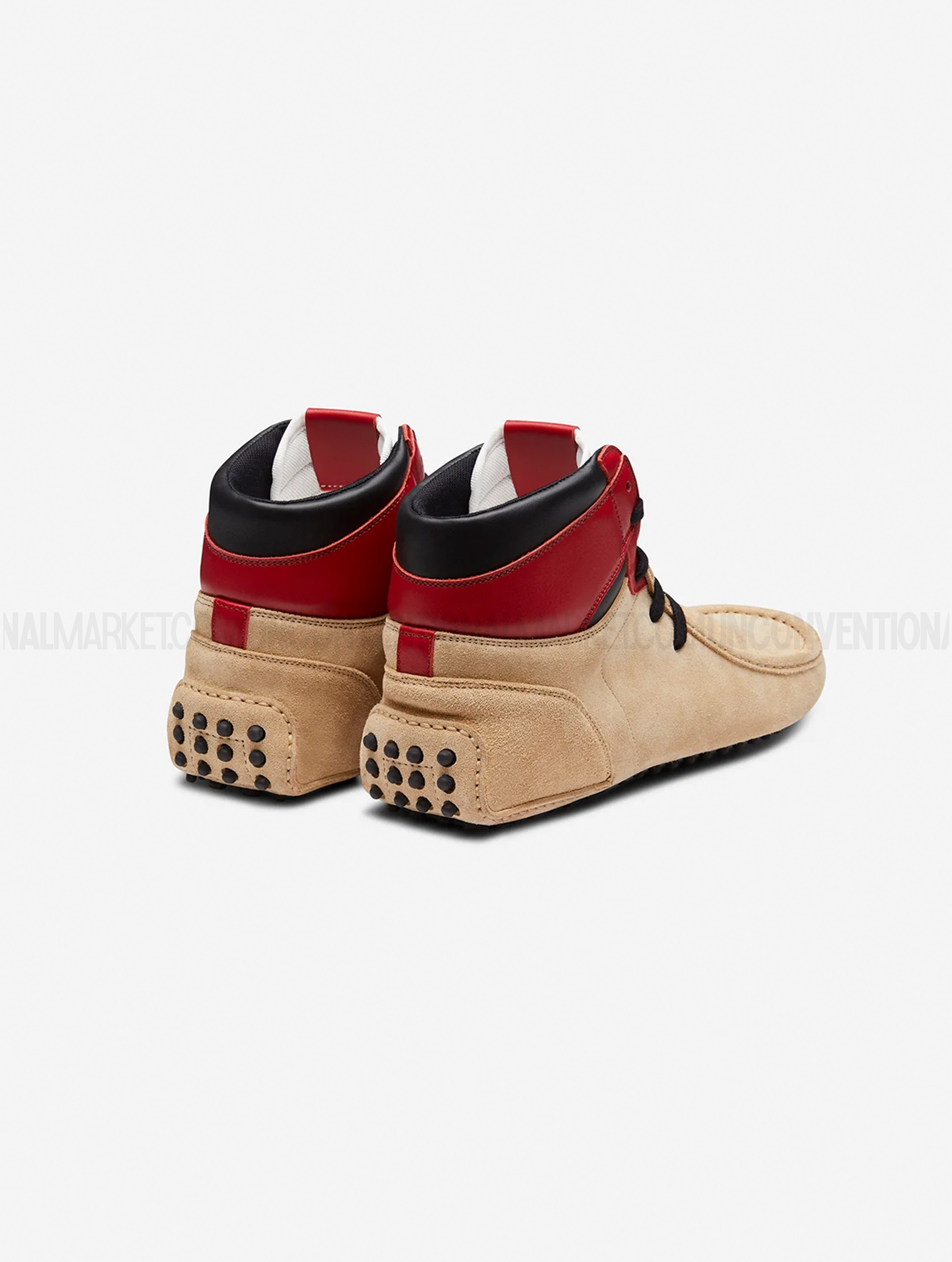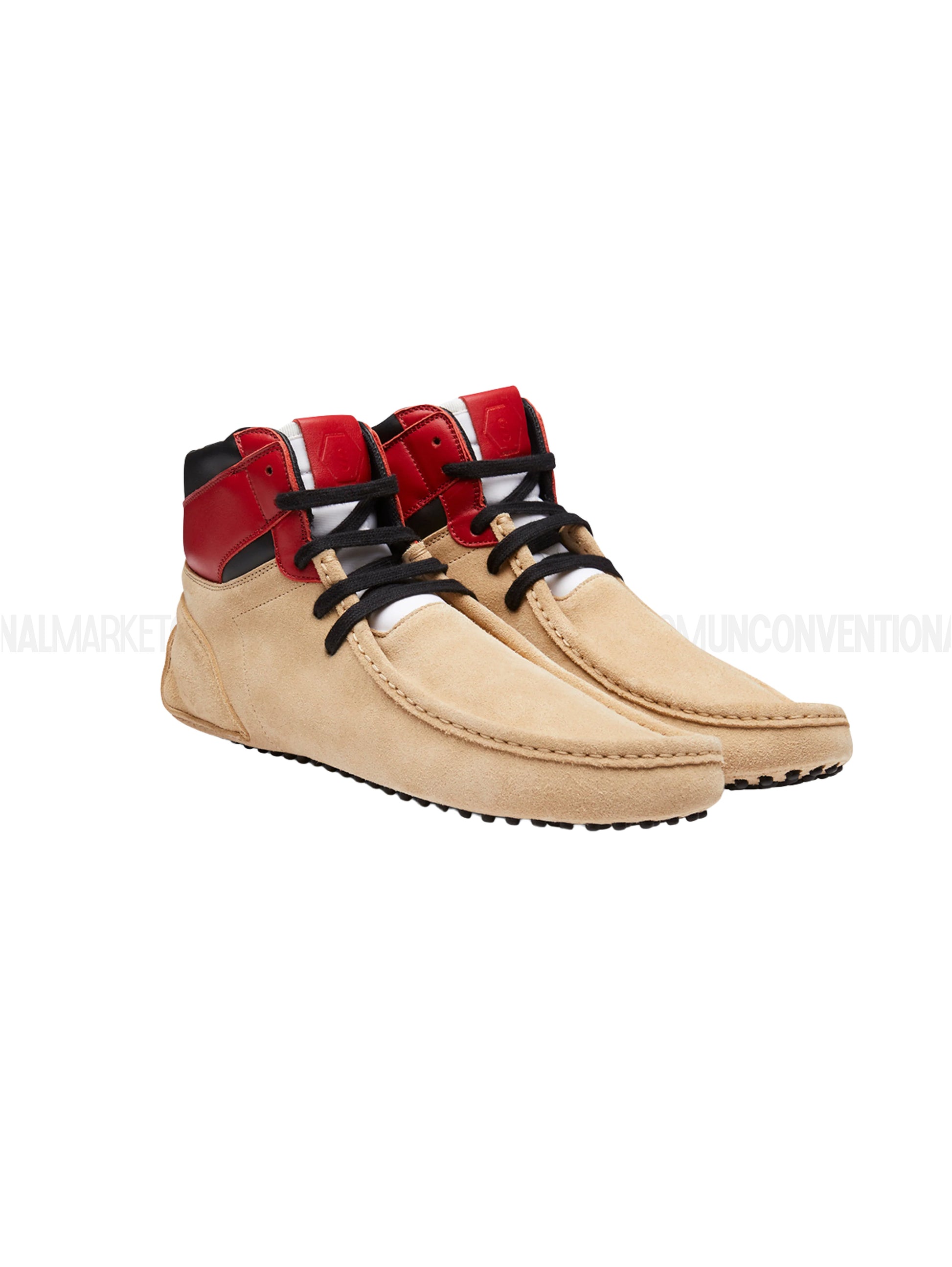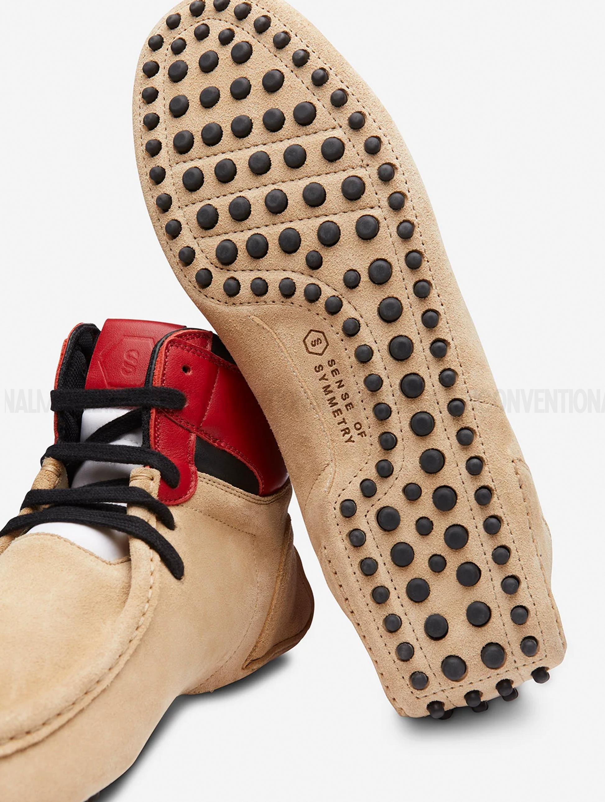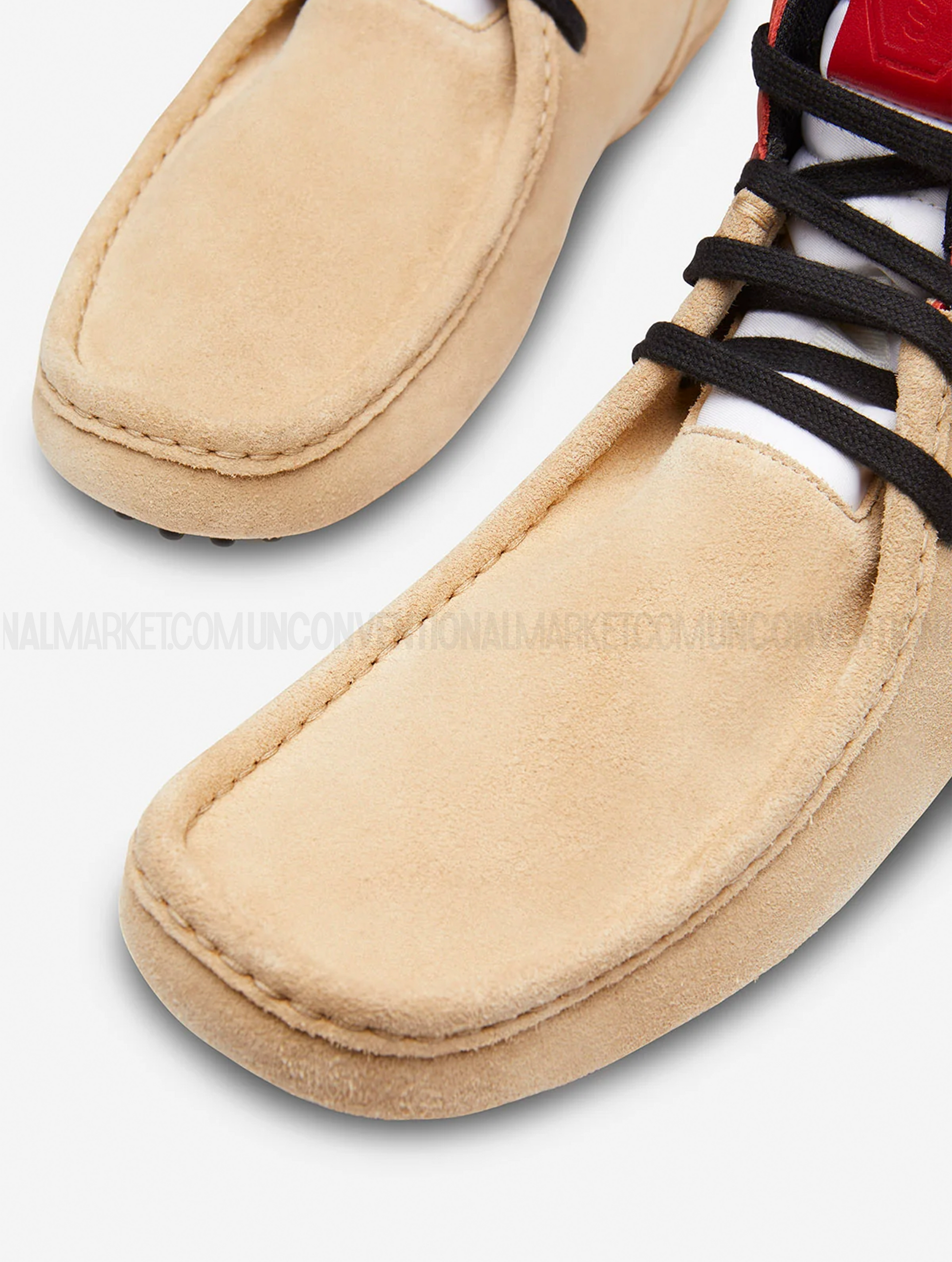 This shoe is a unique hybrid between a Dunk and a classic car shoe, crafted from suede and leather, featuring rubber pebbles on the sole for enhanced grip and a distinctive look.