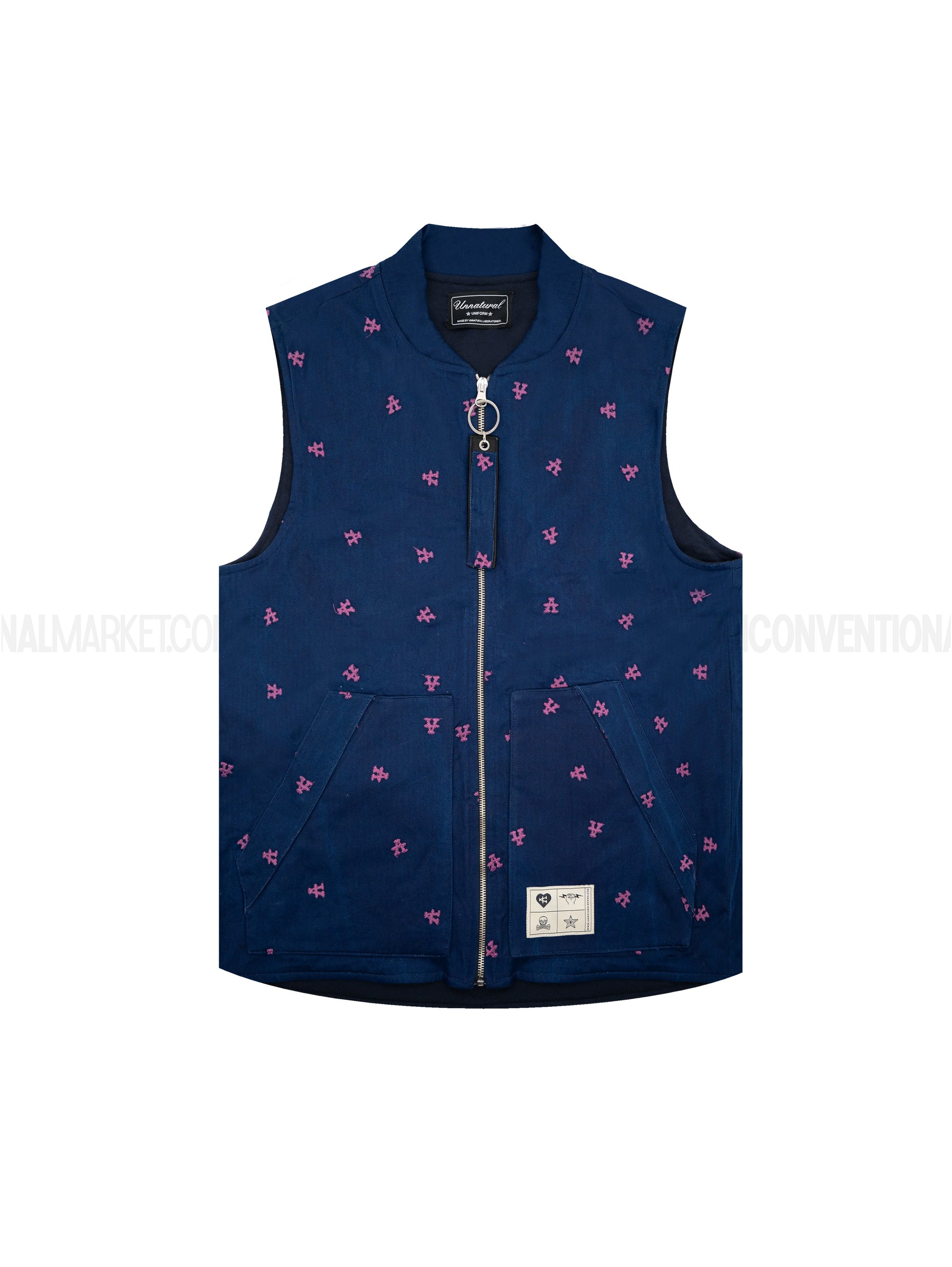 A garment that blends textile research and urban attitude. Made from diamond canvas, an iconic fabric known for its strength and three-dimensional texture, this sleeveless jacket embodies the essence of Unnatural's identity.
