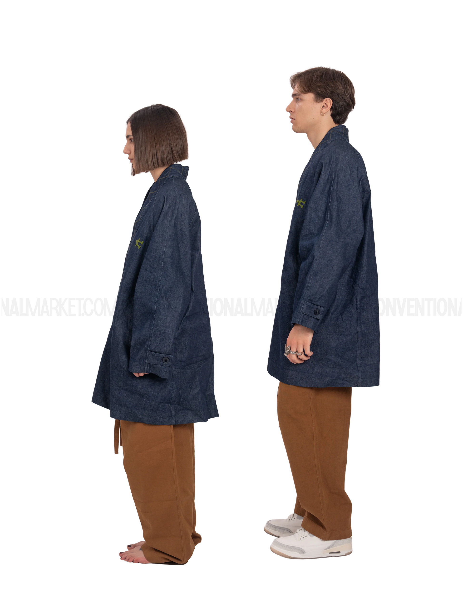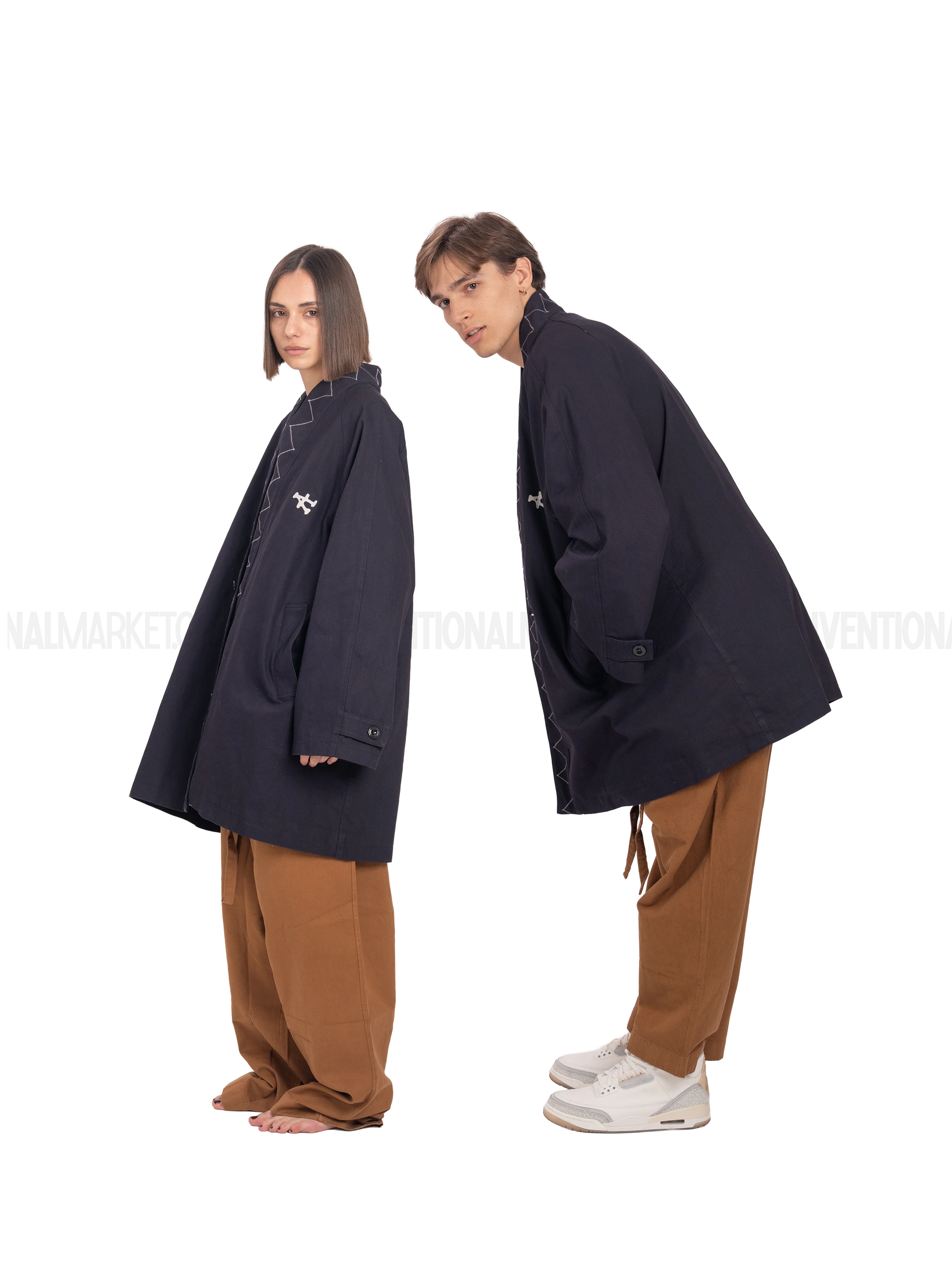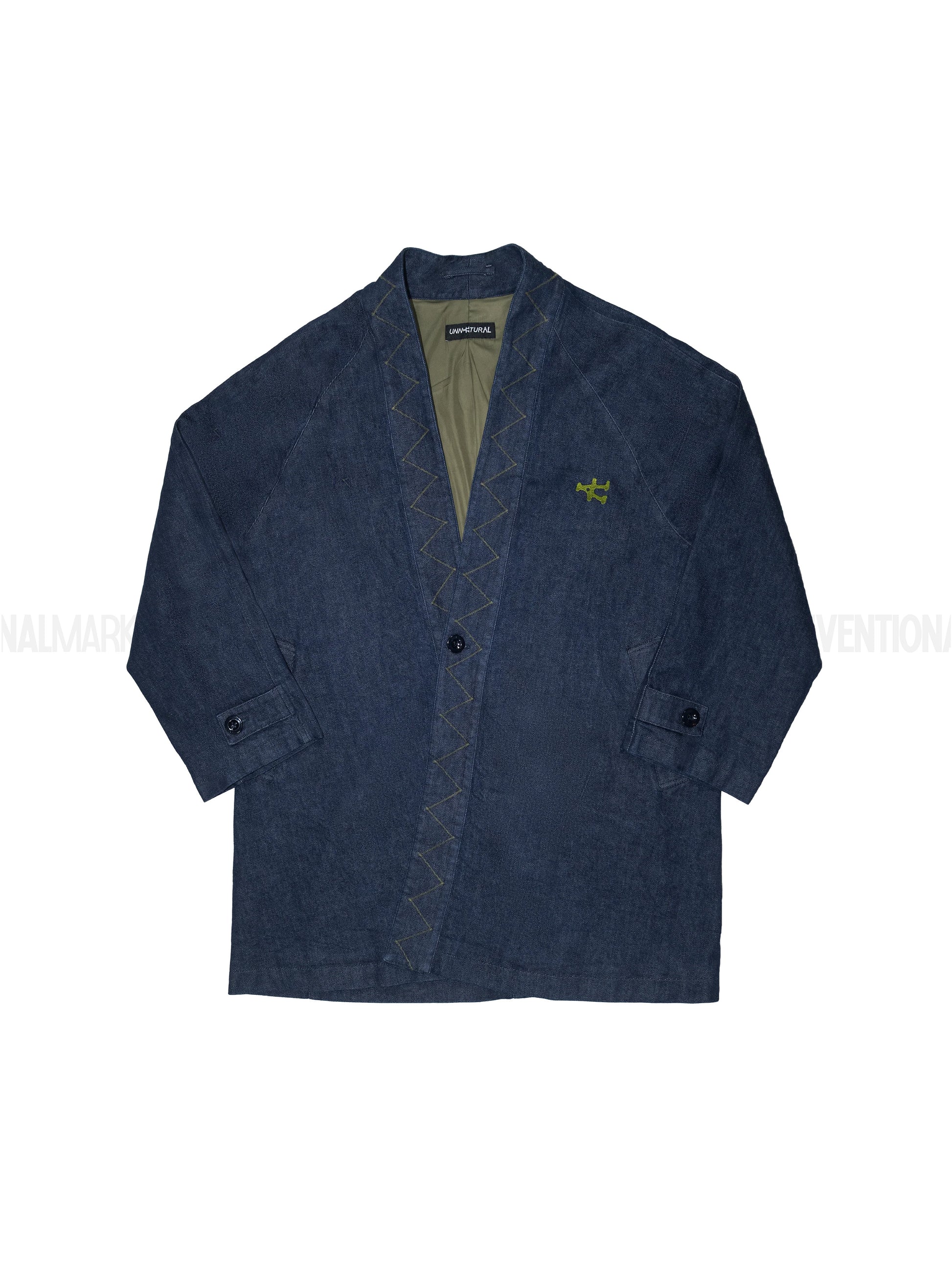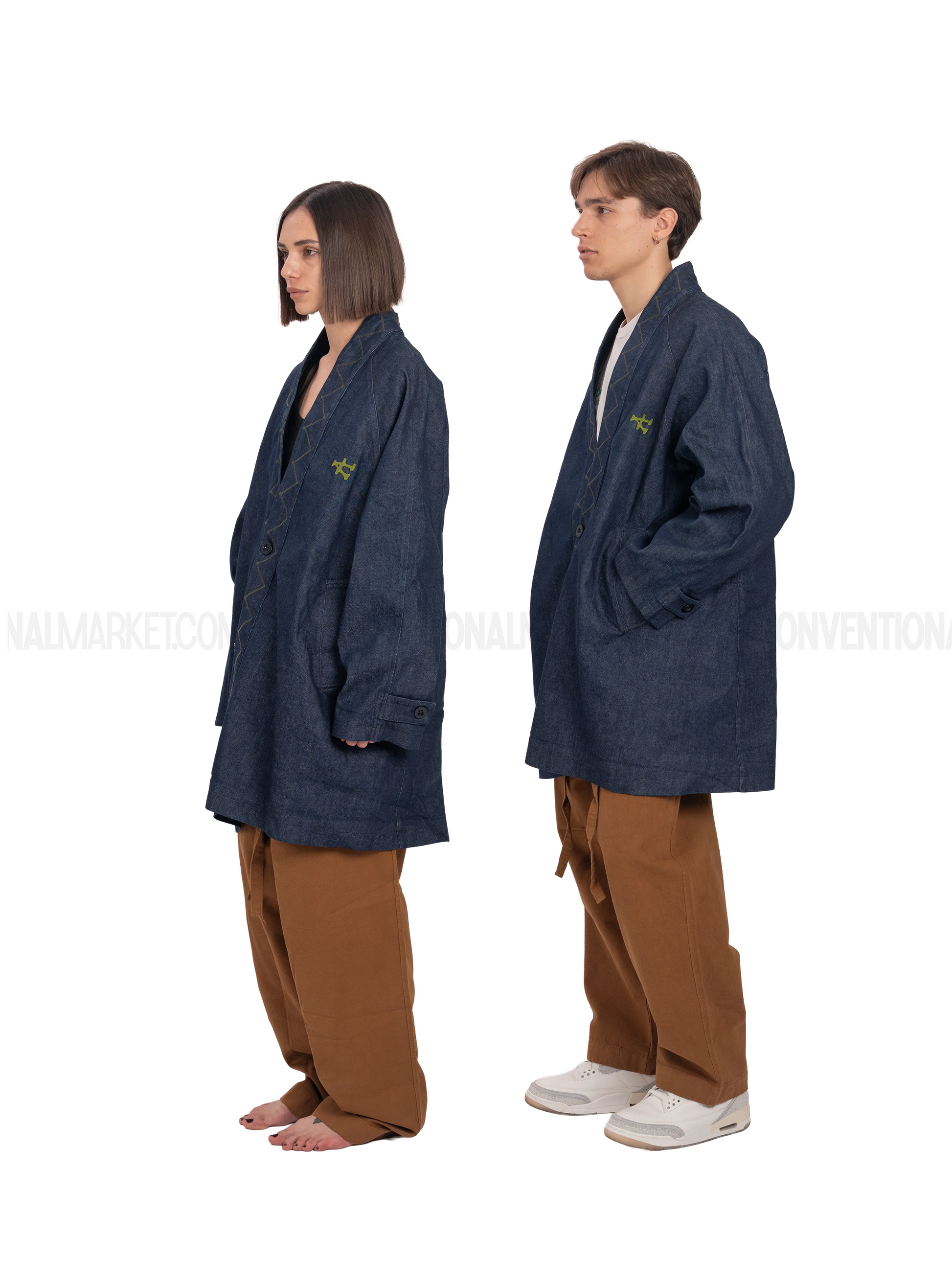 The SAM kimono reinterprets the iconicity of oriental shapes through a contemporary and rebellious lens. Made of washed and resined raw denim, this garment combines the textural rigor of military uniforms with the expressive freedom of researched streetwear. The zig-zag stitch decorative edging, inspired by archival tactical stitching, follows the lines of the kimono accentuating its structure with a bold and sophisticated contrast. A detail that is not just aesthetics, but code: grit and discipline fused in a single gesture. Resin treatment gives visual depth and a lived-in hand to the fabric, making each kimono unique to touch and sight. SAM is not just an outerwear, but a statement: for those who choose to stand out with quiet authority.