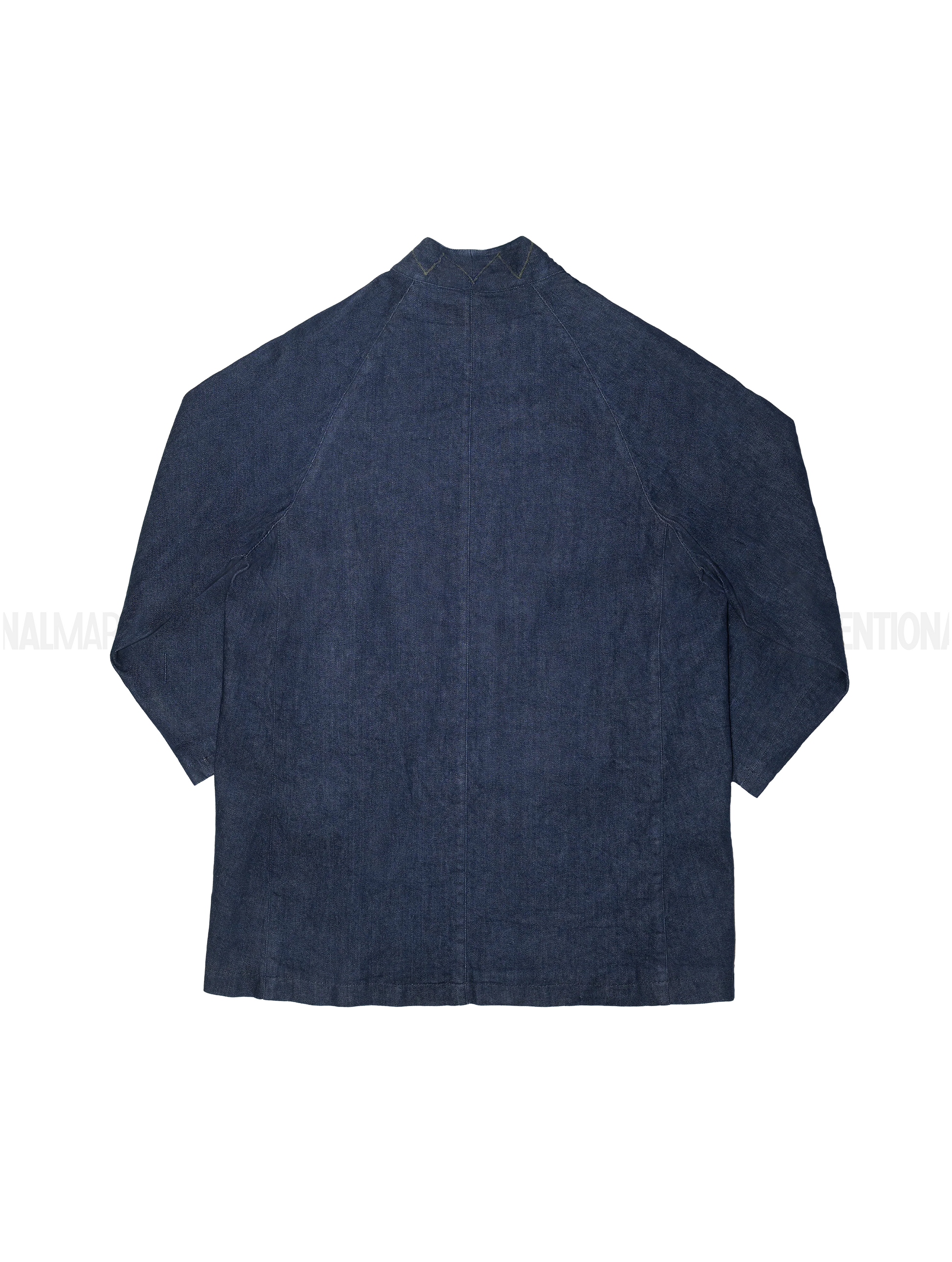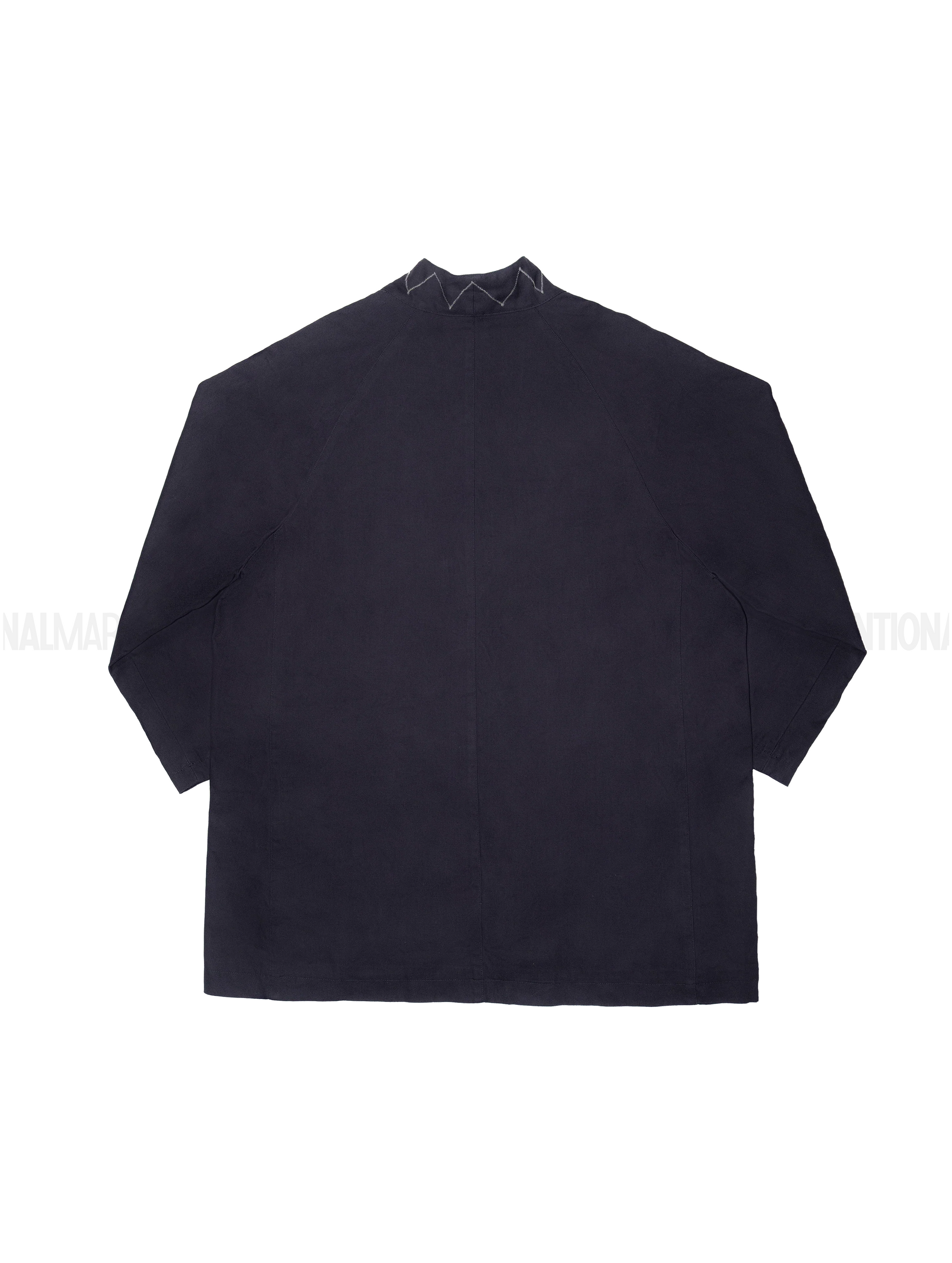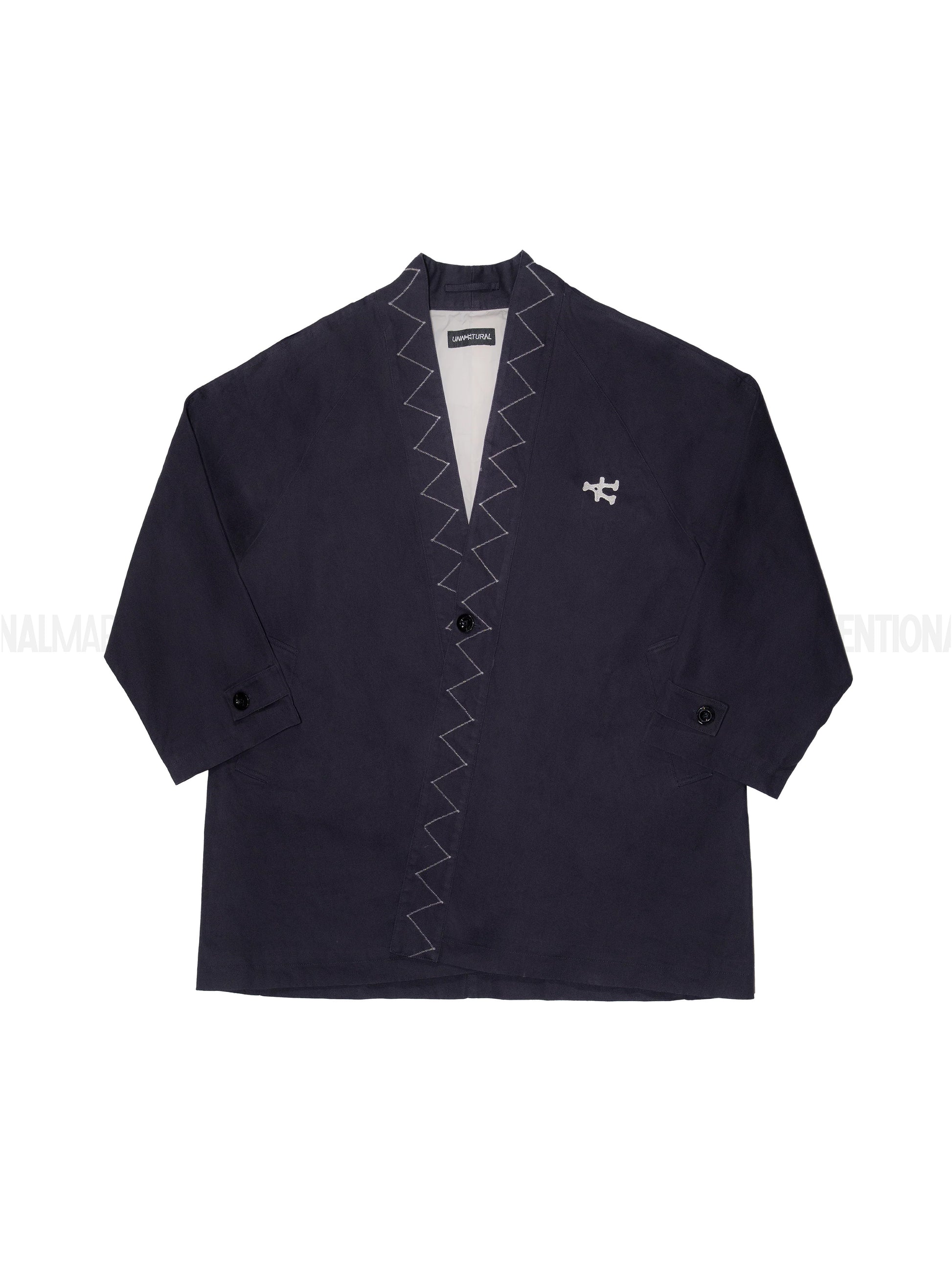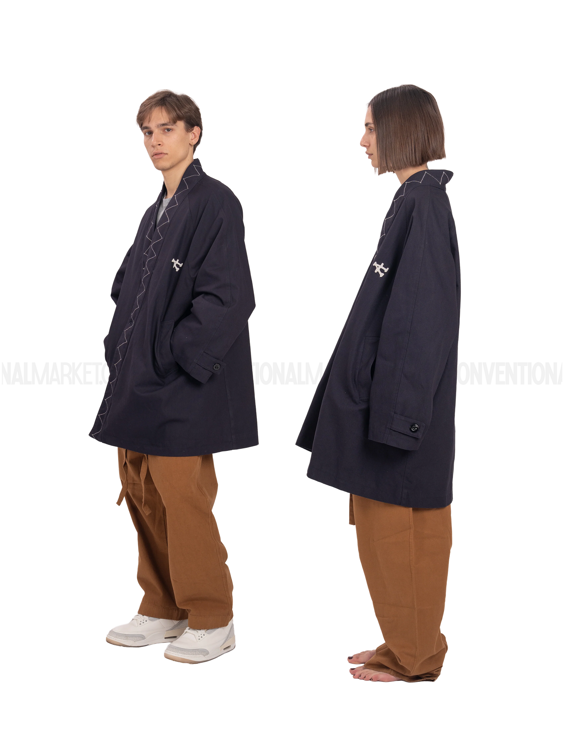 The SAM kimono reinterprets the iconicity of oriental shapes through a contemporary and rebellious lens. Made of washed and resined raw denim, this garment combines the textural rigor of military uniforms with the expressive freedom of researched streetwear. The zig-zag stitch decorative edging, inspired by archival tactical stitching, follows the lines of the kimono accentuating its structure with a bold and sophisticated contrast. A detail that is not just aesthetics, but code: grit and discipline fused in a single gesture. Resin treatment gives visual depth and a lived-in hand to the fabric, making each kimono unique to touch and sight. SAM is not just an outerwear, but a statement: for those who choose to stand out with quiet authority.