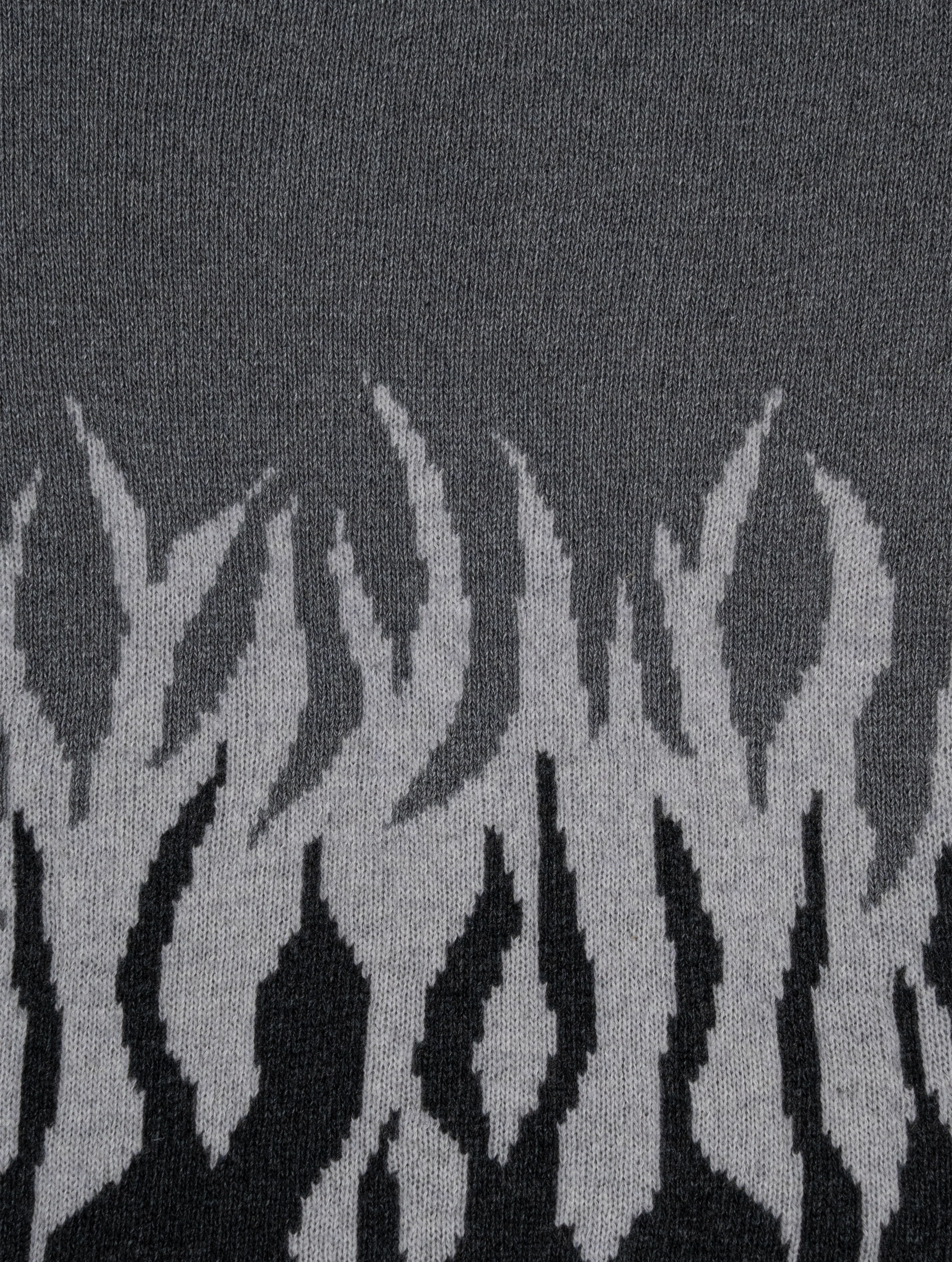 The jacquard flame motif develops from bottom to top, creating a visual transition that energizes the garment without the need for logos or graphics. Every detail is deliberately essential: clean edges, a boxy fit, broad shoulders, and contemporary proportions.