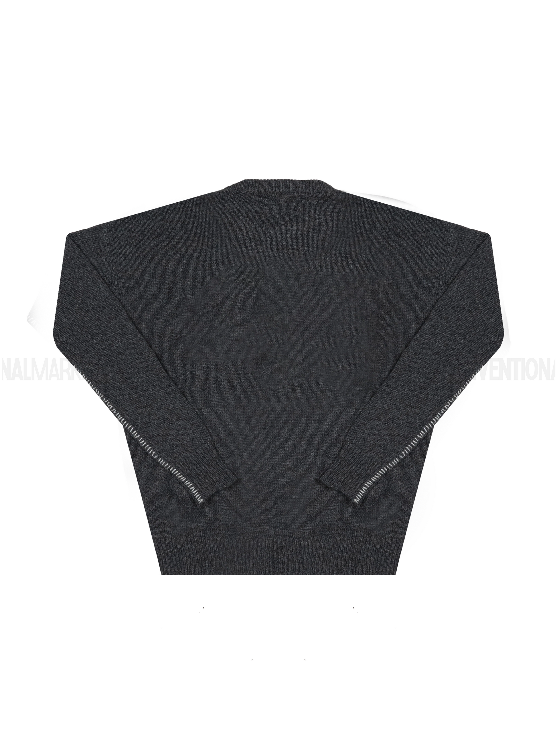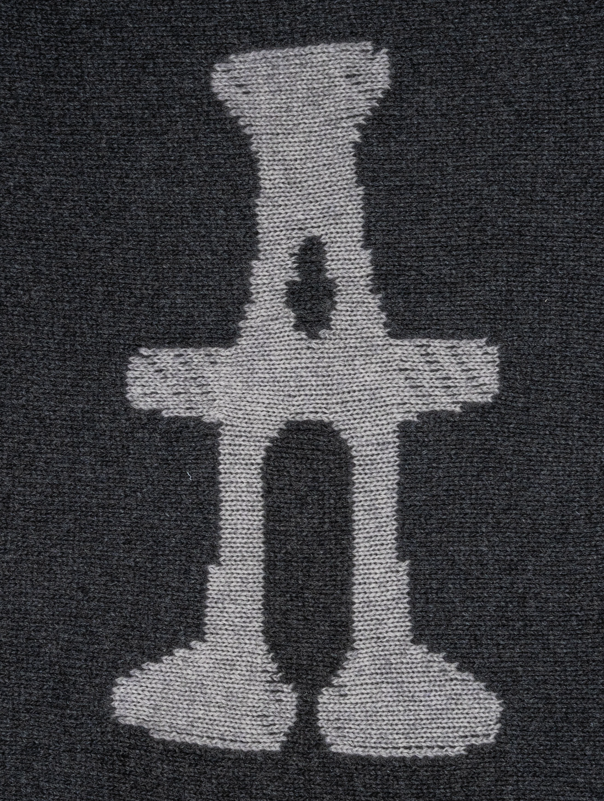 The iconic Unnatural logo is woven directly into the fabric, not printed: a graphic element that becomes an integral part of the sweater, with a textured, three-dimensional presence. The visible zigzag stitching on the sleeves emphasizes the garment's artisanal character and the desire to highlight its construction.